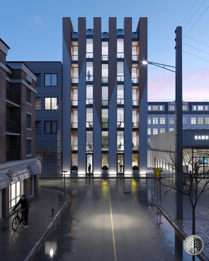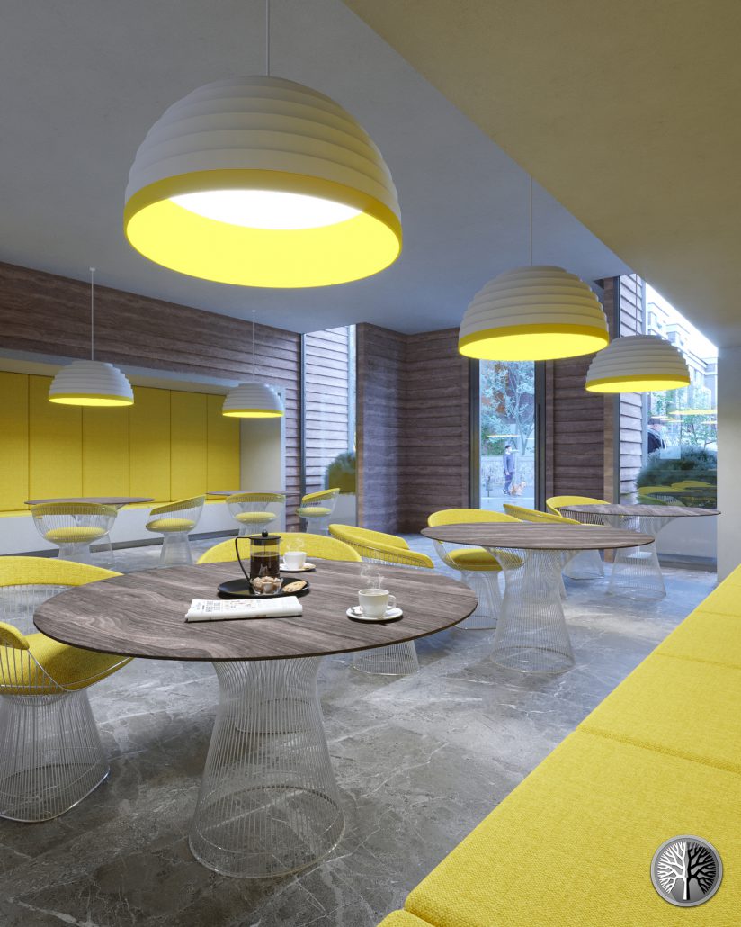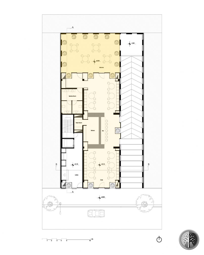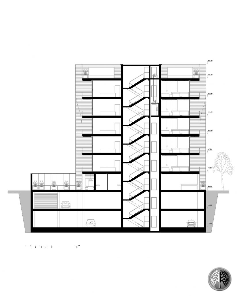 The building has two levels underground of parking with a capacity of 24 cars. A Café with a cozy terrace and a lobby for offices located on the ground Floor. Five office floors, each floor including a management and conference room, an accounting room, a staff room, a kitchen and two bathrooms. And on the roof, there is a green space for the office events.