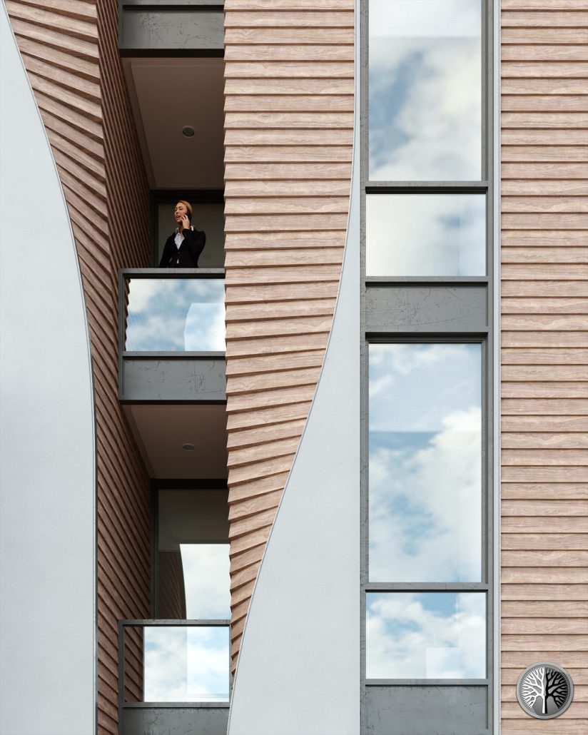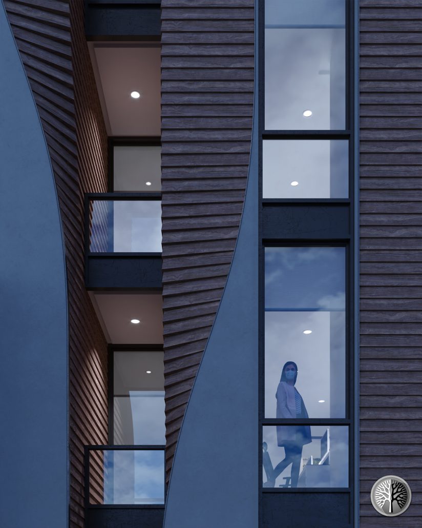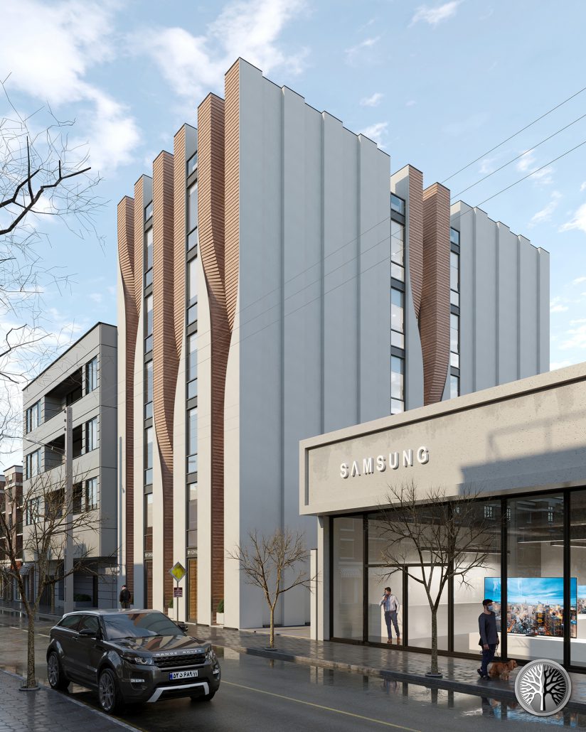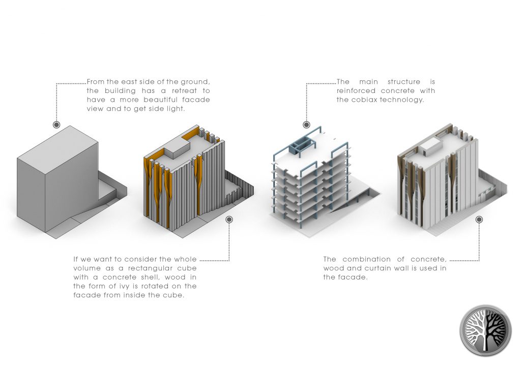 Located in a site of 620 m2. If we want to consider the whole volume as a rectangular cube with a concrete shell, wood in the form of ivy is rotated on the facade from inside the cube. From the east side of the ground, the building has a retreat to have a more beautiful façade view and to get side light. Small terraces for staff’s refreshment. The main structure is reinforced concrete with the “Cobiax” technology. The combination of concrete, wood and curtain wall is used in the facade. The wooden parts are secured with steel from behind.
